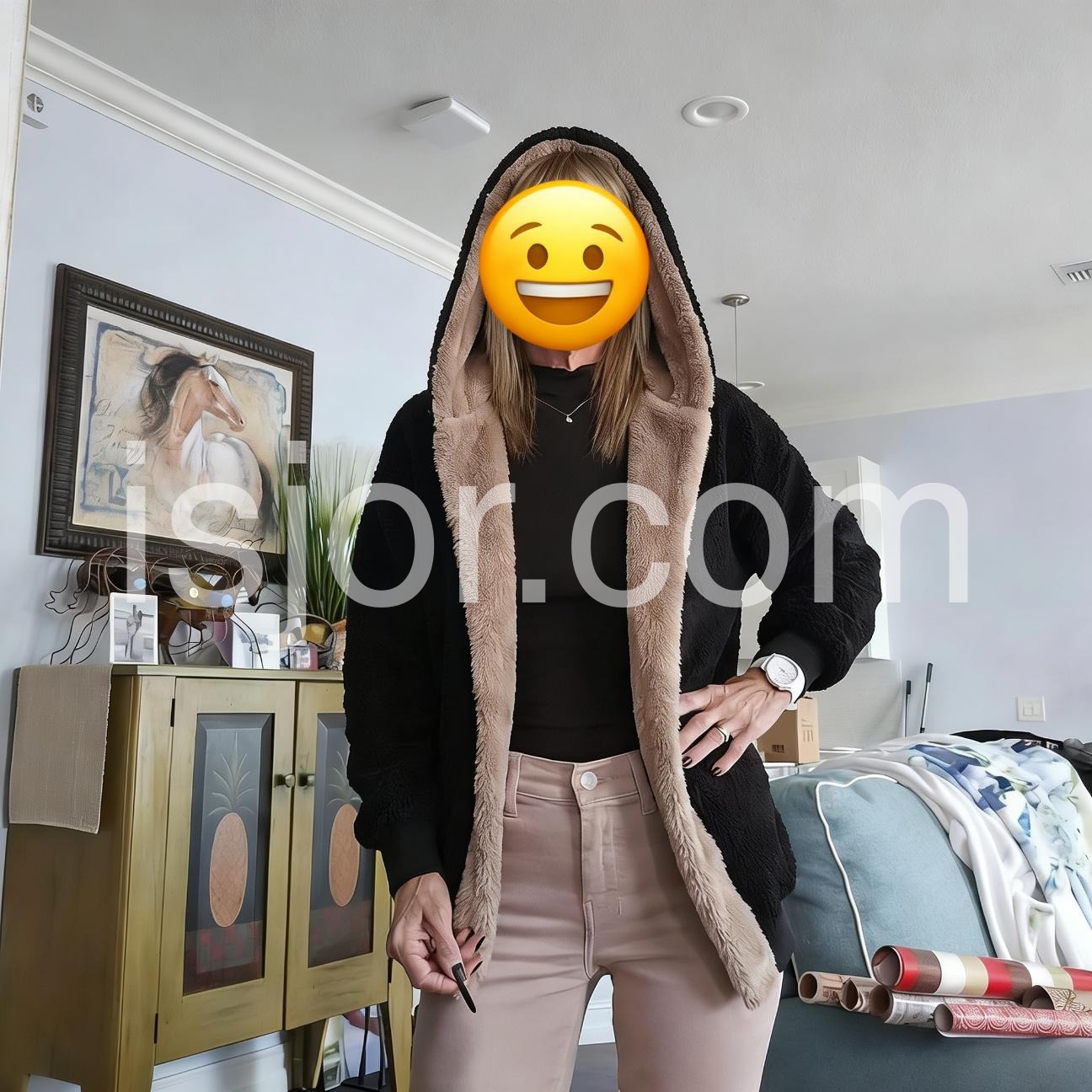 This baggy open-front cardigan features a plush faux fur lining and a cozy hood, blending comfort with style. Its relaxed fit provides ease of movement and a modern silhouette, while the soft lining ensures warmth during cooler days. Ideal for layering, this cardigan offers a versatile addition to your wardrobe that combines casual appeal with luxurious texture.